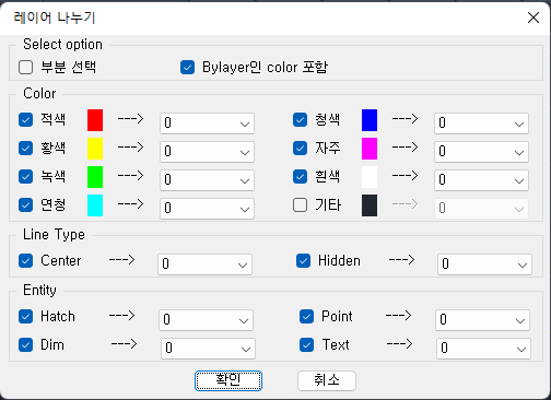 - 강제색 변경이 많아 레이어 구분이 어려운 도면에서 사용