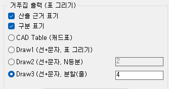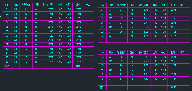 - APY(폴리선 면적산출) 및 FORM(거푸집산출), M4(표제란 그리기)등 에서 생성되는 표를 여러개의 표로 나누기적용