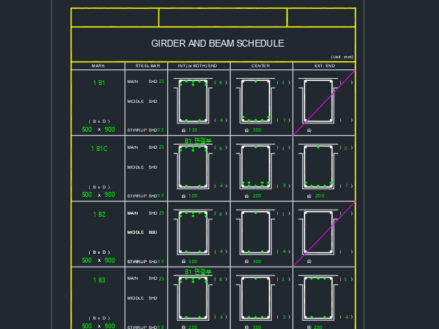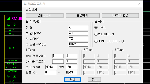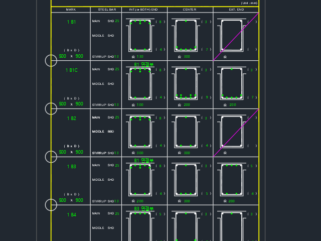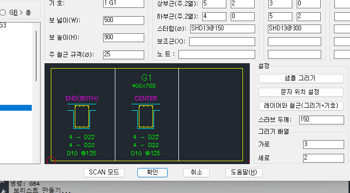 - 삽입점 > 우측지점(대각점) > 보이미지 중심 > 기호 > 크기 > 상부근 > 하부근 > 스터럽 > 보조근(X) > 추가노트