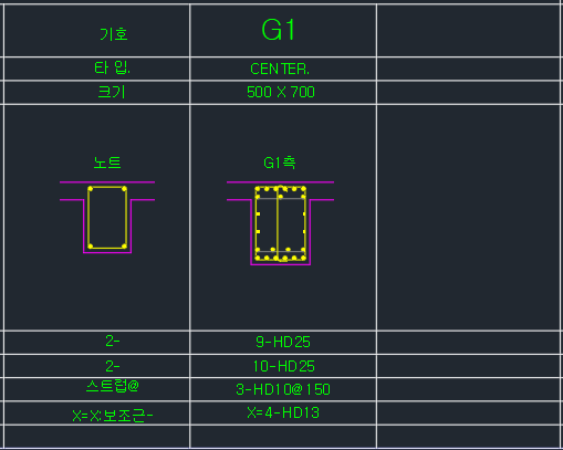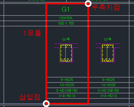 - 삽입점 > 우측지점(대각점) > 보이미지 중심 > 기호 > 크기 > 상부근 > 하부근 > 스터럽 > 보조근(X) > 추가노트