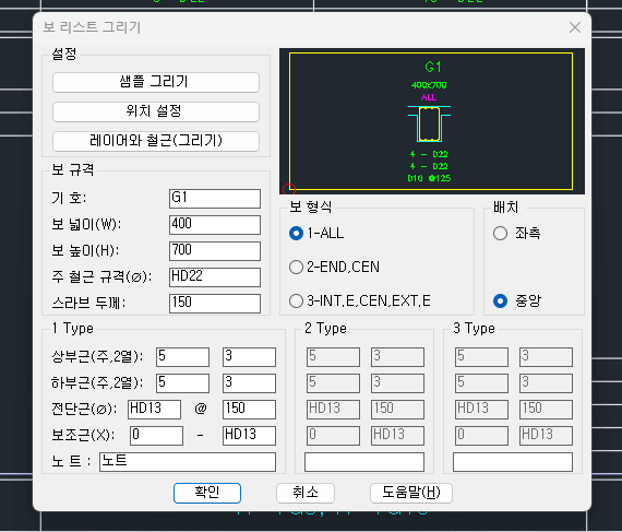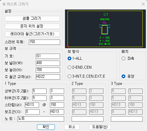 - 철근수량 및 보 크기에 따라 자동으로 리스트를 그린다