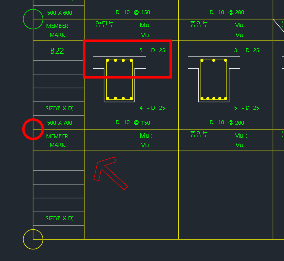 - 이미지에서 주근의 수량/스터럽/표피철근(보조근)의 위치 및 수량 확인