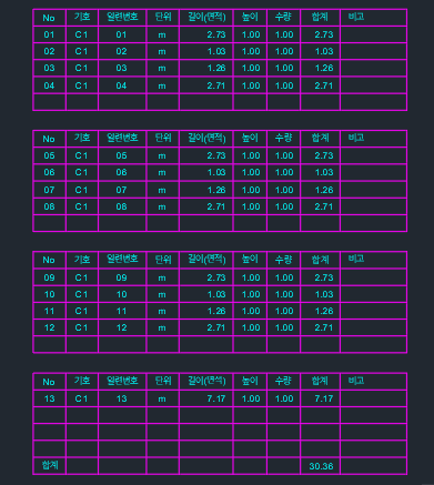- APY(폴리선 면적산출) 및 FORM(거푸집산출), M4(표제란 그리기)등 에서 생성되는 표를 여러개의 표로 나누기적용