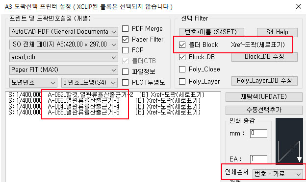 인쇄는 도곽정보(S4SET,도면번호+도면명) 또는 위치에 따라 자동정렬되고 사용자가 추가로 순서를 변경할수 있습니다.
