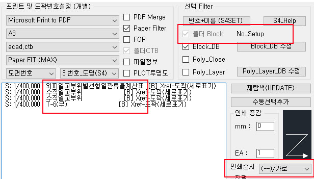 3-3-1 인쇄는 도곽정보(S4SET,도면번호+도면명) 또는 위치에 따라 자동정렬되고