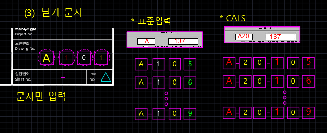 - 낱개 문자 도면번호는 구분자("-")가 없어 구분이 어렵다 (A19001_도면명)