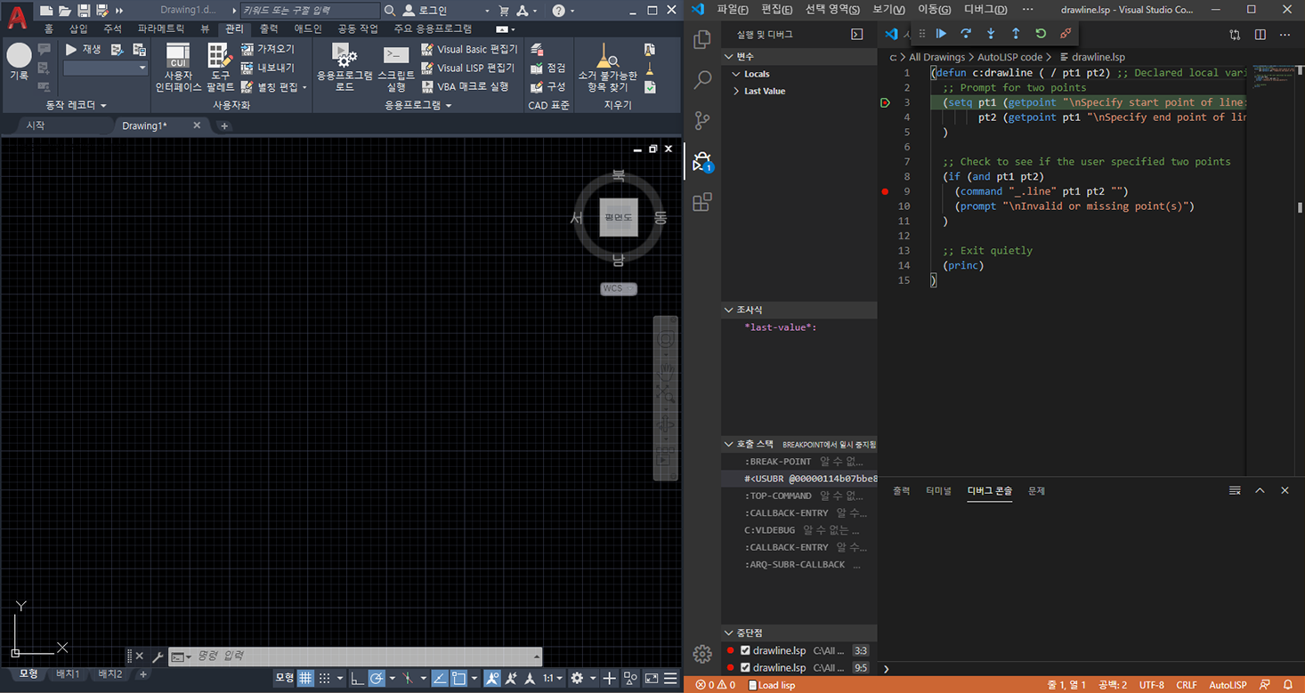 - 디버그 콘솔에서 AutoLISP 코드 문과 AutoCAD 명령 실행