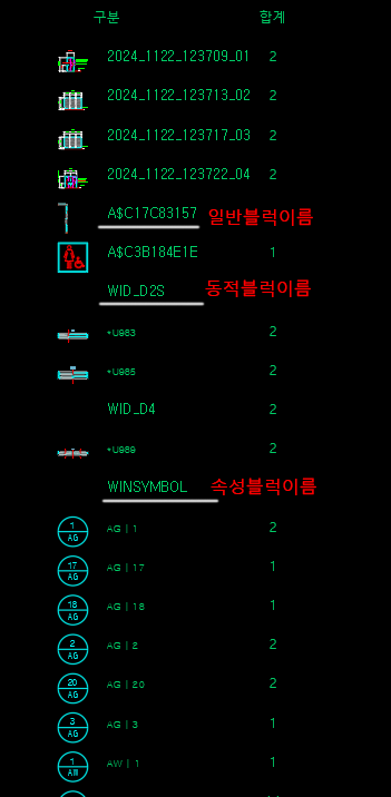 - 속성문자 블록( ATTRIBUTE)의 파일이름은 동일하고 문자 내용이 다름