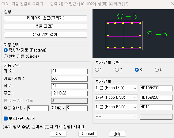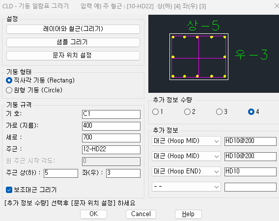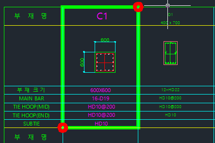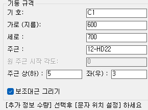 - 보조대근 그리기 : 직사각형기등은 수직/수평 1개씩 원기둥은 주근위치마다 작성함