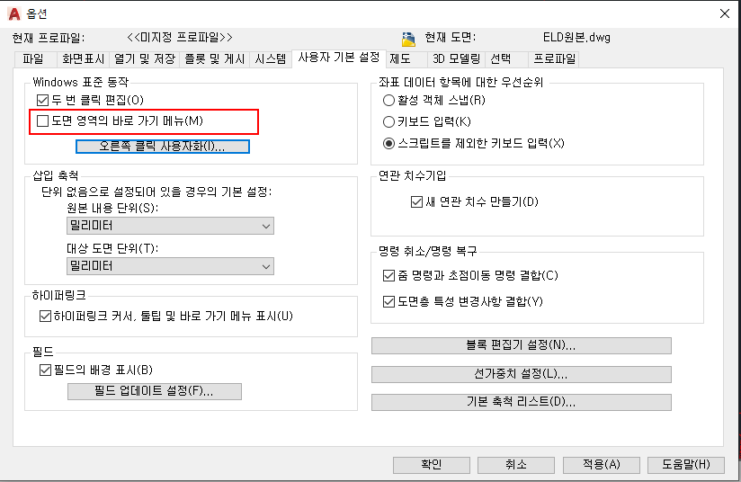 option > 사용자 기본설정(User Preferences)에서다음과 같은 내용을 해제합니다.