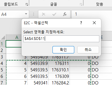 - 순서 : 명령 E2C ▶ 엑셀에서 가져갈 영역 선택 "확인" ▶ DCL (옵션) ▶ 삽입점