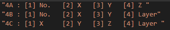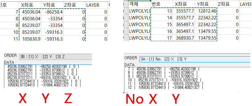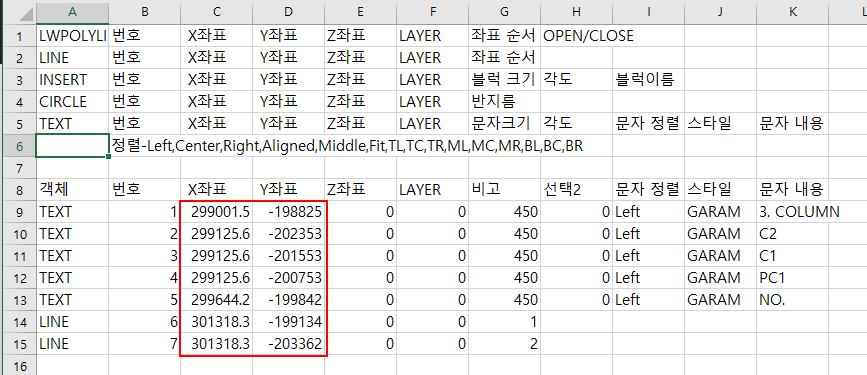 서식순서 : 1객체,2번호,3X좌표, 4Y좌표, 5Z좌표, 6Layer, 7비고(선택1), 8선택2, 9,문자정렬,문자스타일,문자내용