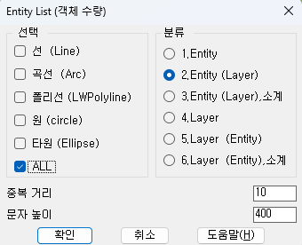 - 분류 : 객체종류 / 레이어 / 객체+레이어 / 객체+레이어+소계 / 레이어+객체 / 레이어+객체+소계
