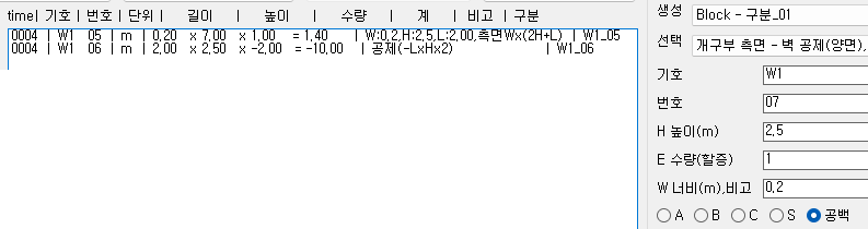 * 문길이객체선택, 개구부 높이와 벽너비를 입력 하여 개구부 측면과 벽 공제면적을 산출