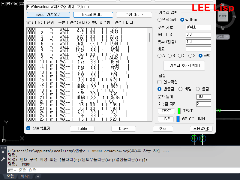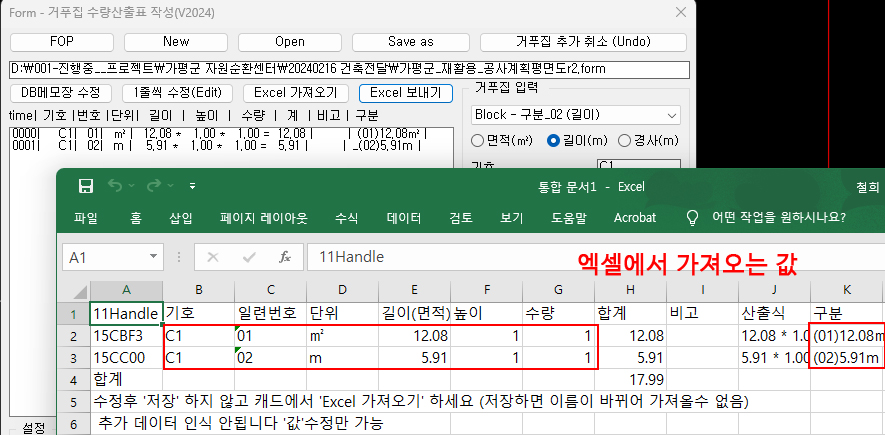 - 수정후 저장없이 캐드에서 Excel 가져오기 (저장하면 파일이름이 변경되어 가져오지 못함)