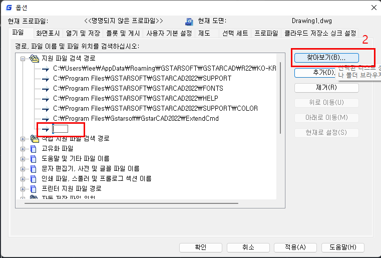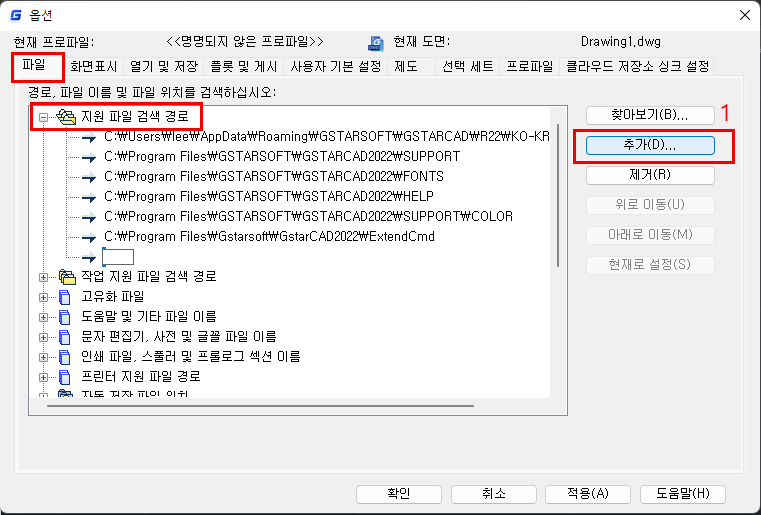 * 캐드기본경로를 수정하시면 안됩니다 꼭! 추가후 찾아보기를 선택하세요