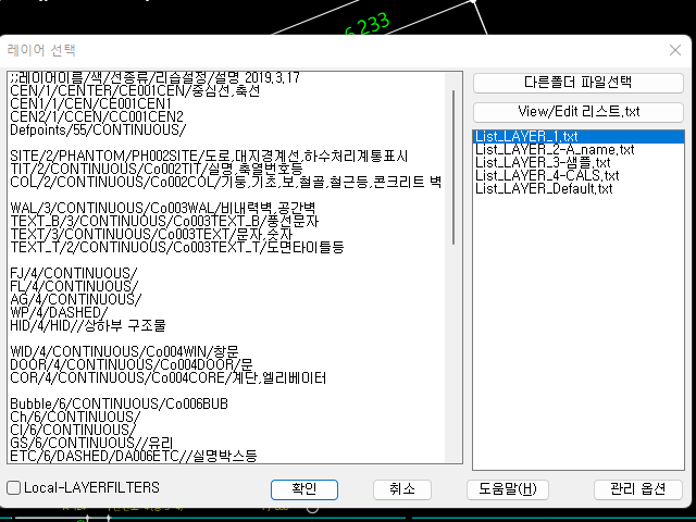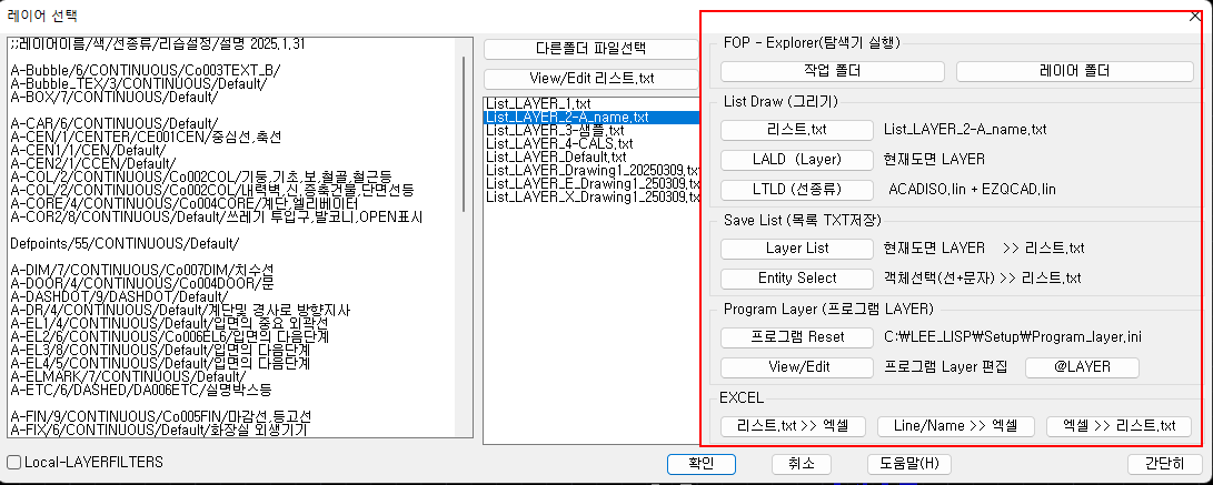 선택한 객체의 문자(레이어명) + 선 (선색과 선종류)를 List_LAYER_E_도면명_일자.txt로 저장 - Program Layer (프로그램 LAYER