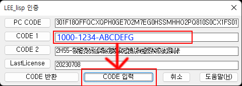 * 서버에서 유효기간을 갱신한경우 CODE1입력 없이도 캐드를 재시작하시면 갱신됩니다