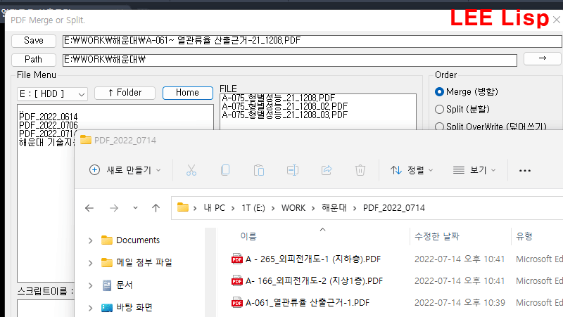 - 파일 분할은 'PDF_파일이름' 폴더를 생성후 저장됨 (옵션에 따라 덮어쓰기 및 다른이름으로 저장됨)