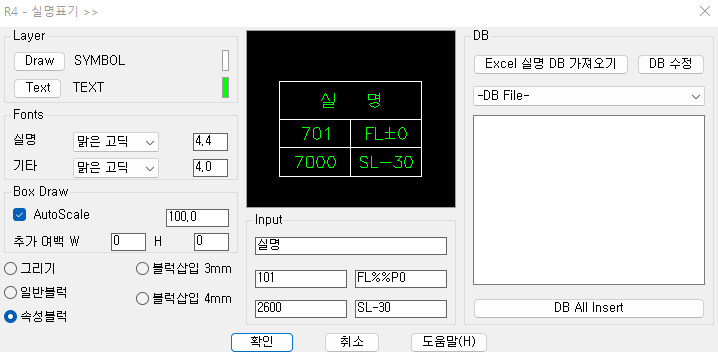 - 블럭삽입 4mm : Data폴더에 있는 심볼을 삽입 ( 실명 5 기타 4mm ,A1기준)