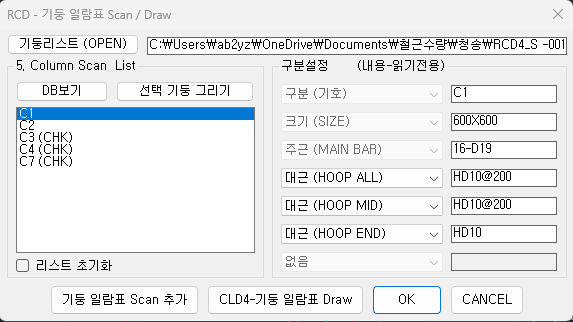 기둥일람 설정/Scan/Draw : 대근에 대한 설정이 필요함