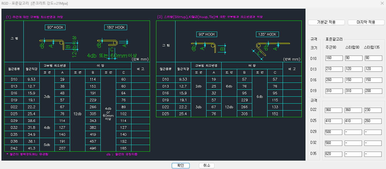 - 주근 / 스터럽90 / 스터럽 135용으로 각각설정