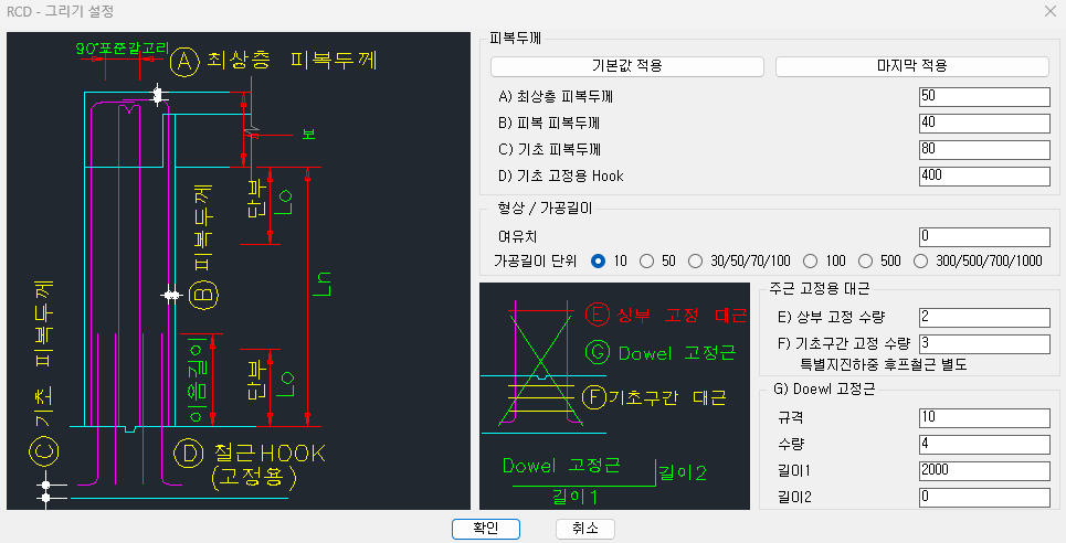 - 모두 : 선과 문자를 모두 철근규격에 따라 D10~D35의 레이어 적용 - 현재 선택된 레이어 이름과 설정된 레이어 변경가능