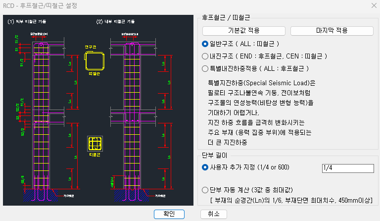 - 단부 자동 계산 (부재의 순간격의 1/6,부재크기,450mm이상중 큰값 자동선택
