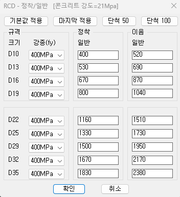 정착 /이름 길이 - 콘크리트와 철근규격에 따라 변경
