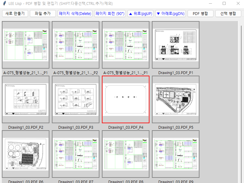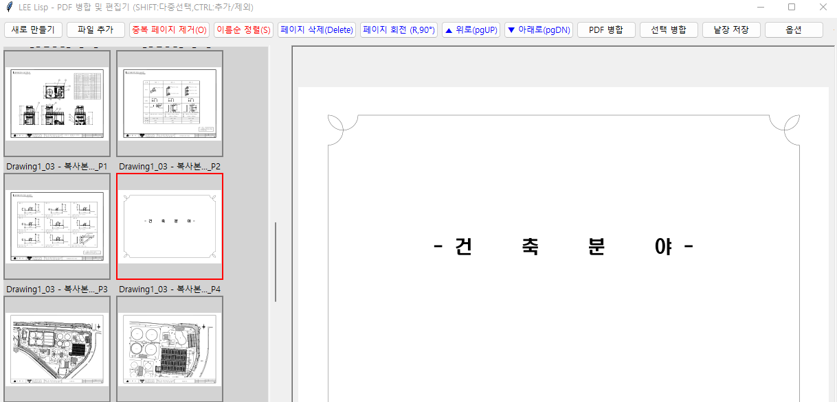 비연속 선택 시: 페이지 순서, 회전, 삭제, 선택 병합 가능 - 저장 기능