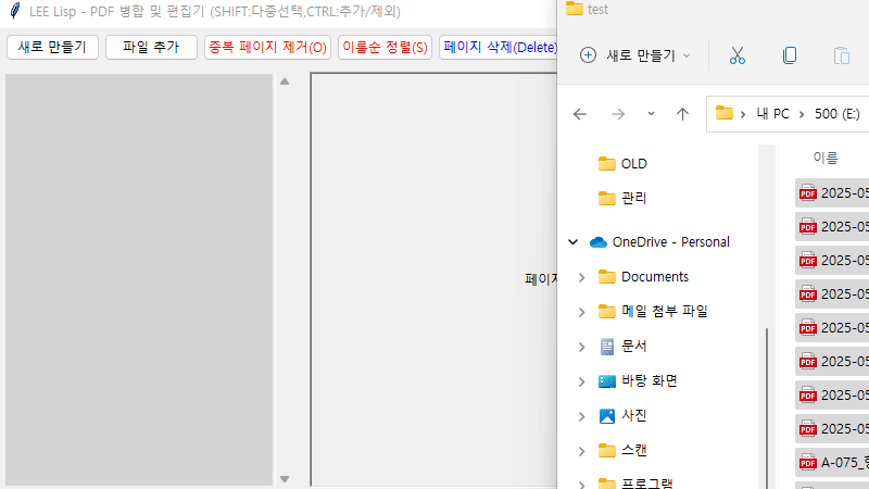 페이지별 상세 작업(위로/아래로, 회전, 삭제, 병합) 버튼 및 키보드 단축키 가능 - 우측 미리보기