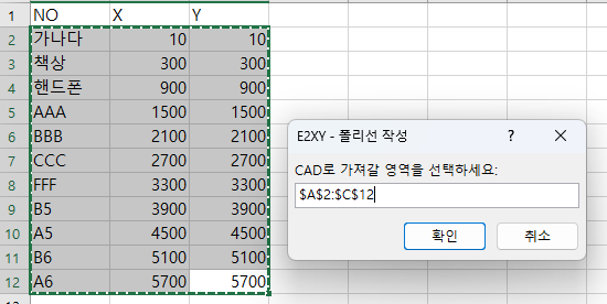 1.위 그림처럼 엑셀에서 가져가려는 문자를 No위치에 넣고 가려가려는 영역을 선택합니다