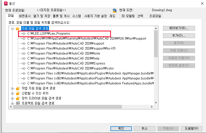 간이설정으로 캐드종료후 추가 레지스트리 배치파일(LEE_lisp_ADD_REG.bat)을 생성후 추가하거나