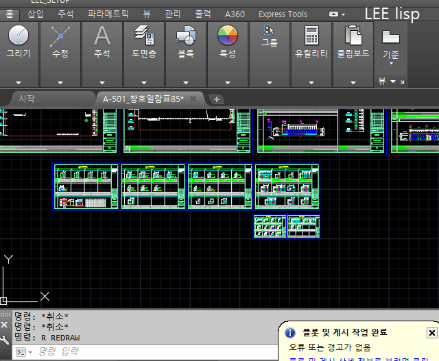 일반적인 설계사무실에서는 모형공간에 도곽을 삽입하여 작업하고 있어 게시를 사용하기에 적합하지 않습니다.