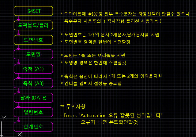 S4SET은 도곽블럭과 도면번호,도면명,축척등의 위치를 저장합니다