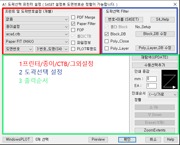 도면내 블럭을 직접선택(A3)하거나 자동선택(AA3) 출력하는 프로그램으로 설정된 프린터와 종이 CTB를 이용하여 출력합니다