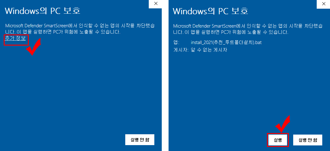설치 경고 (인터넷에서 받은 파일) > 추가정보 > 실행