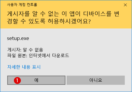 설치 경고 (인증서가 없거나 공인인증을 받지 않은 프로그램 : 노랑색) > 예 선택