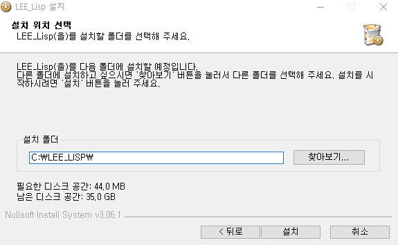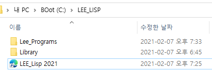 - 기본설치위치 C:\LEE_LISP ( 읽기/쓰기 가능한 경로 )