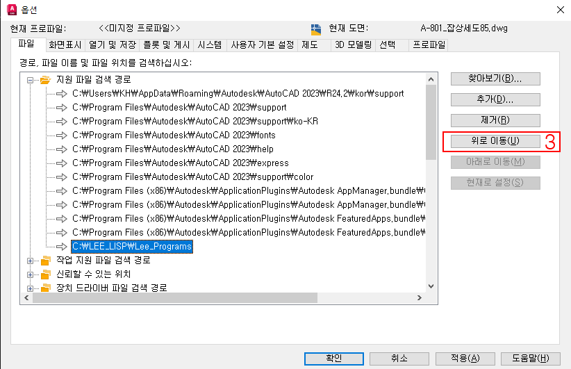 A. Options > 파일 > 지원파일 경로 > 추가 > 찾아보기 > C:\lee_lisp\lee_Programs (순서1번)