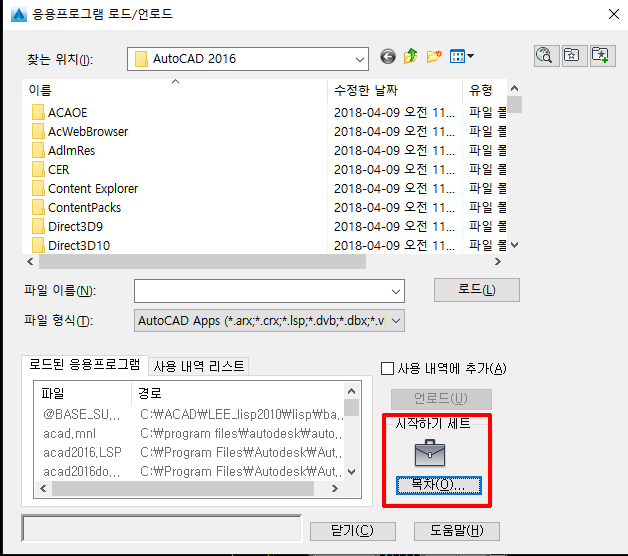 C. APPLOAD > 시작하기 모음 (목차) > 추가 > Lee_LISP.LSP 또는 Lee_LISP_main.fas선택