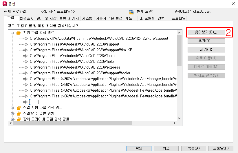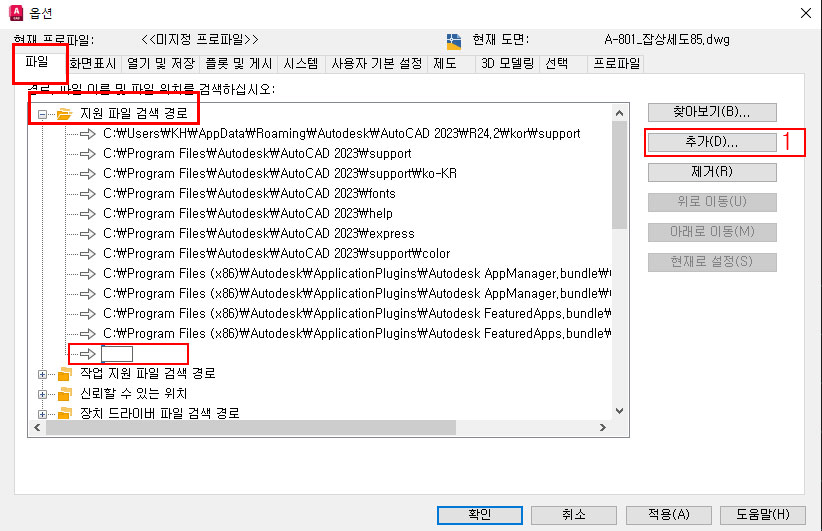 * 캐드경로를 수정하시면 안됩니다 꼭! 추가후 찾아보기를 선택하세요