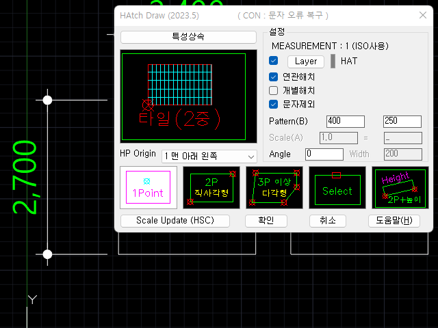 기본값을 선택하면 캐드명령 HPORIGIN으로 선택한 점을 기준점으로 사용가능