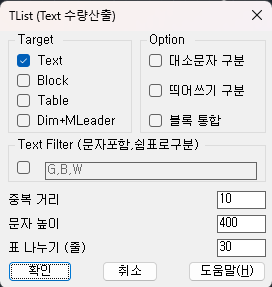 - Wlist : 원, 타원, 블럭(문자가 없는 블록),폴리선과 중복된 문자(Text,Mtext)의 수량산출